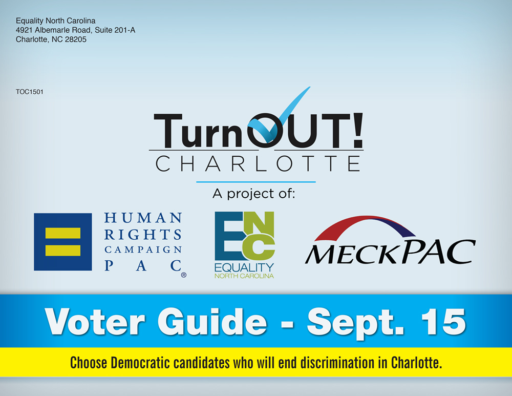 Mailers for the TurnOUT Charlotte! get-out-the-vote campaign began arriving in local voters’ mailboxes on Thursday. The coalition effort from the Mecklenburg LGBT Political Action Committee (MeckPAC), Equality North Carolina and the Human Rights Campaign hopes to combine voter outreach through mailers, phone banking, canvassing and other activities. Their goal is to turn out LGBT and ally voters for Charlotte’s Sept. 15 primary (early voting is open now) and elect a mutually endorsed slate of at-large and district City Council candidates.